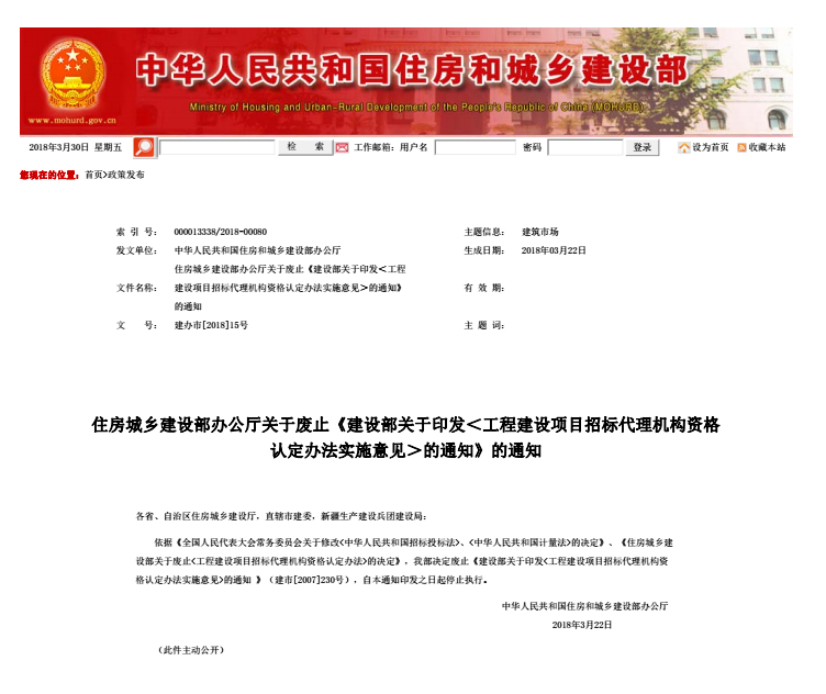 《住房城鄉建設部關于廢止<工程建設項目招標代理機構資格認定辦法>的決定》已經2018212日第37次部常務會議審議通過,現予發布,自發布之日起施行。