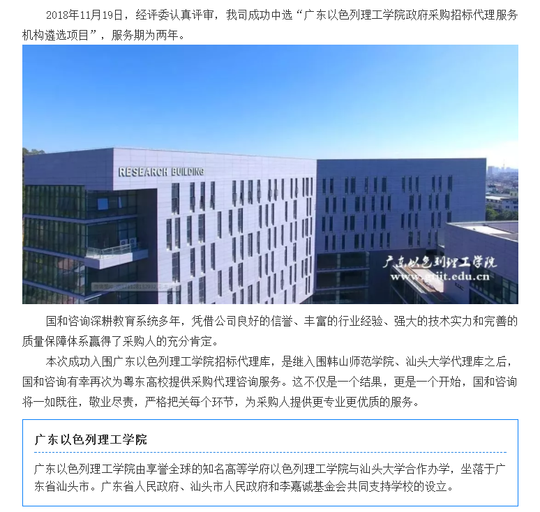我司成功中選“廣東以色列理工學院政府采購招標代理服務機構遴選項目”
