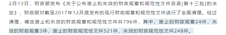 為了適應依法行政、依法理財的需要,根據《財政部規章和規范性文件清理工作規則》,我部對截至2017年12月底發布的現行財政規章和規范性文件進行了全面清理。經過清理,確定廢止和失效的財政規章和規范性文件共796件,其中,廢止的財政規章24件,失效的財政規章3件,廢止的財政規范性文件521件,失效的財政規范性文件248件。現將廢止和失效的財政規章和規范性文件的目錄予以公布。
