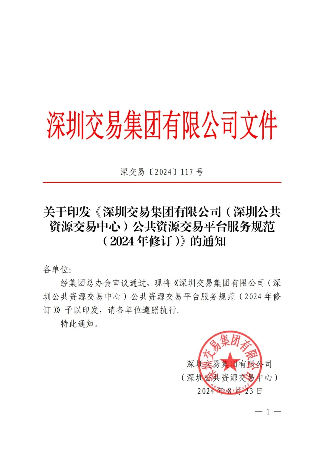 深圳市公共資源交易中心關于印發《深圳交易集團有限公司(深圳公共資源交易中心)公共資源交易平臺服務規范(2024 年修訂)》的通知